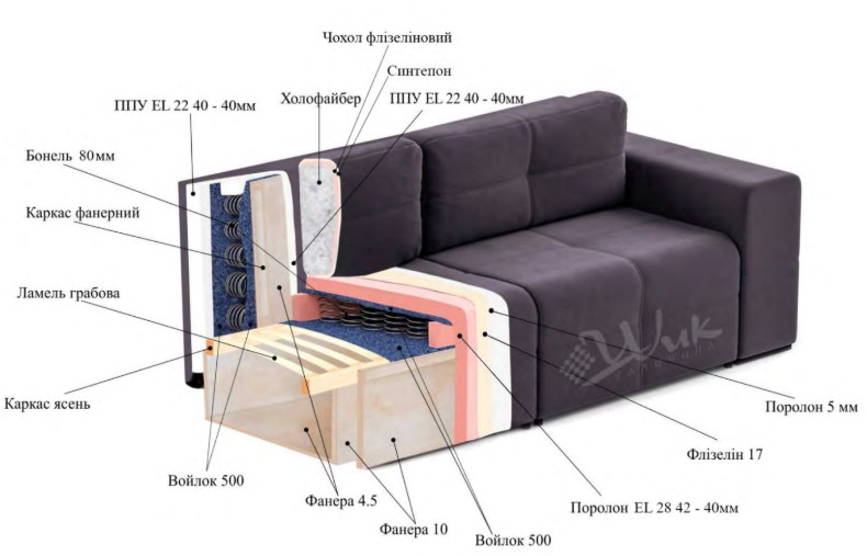 Поролон 5мм – ППУ марки EL 22 40. Надає дивану ефектної форми.